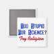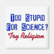 É hora de lutar contra os fanáticos religiosos que querem negar a Ciência a favor da superstição. Em letras azuis "Muito estúpido para a ciência?" respondeu em letras vermelhas "Tente a religião."