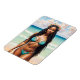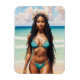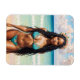 Este ímã apresenta trabalho de arte de pintura a óleo de uma linda garota negra com cabelo comprido em torres ou cadeados, vestindo um biquíni teal e uma coroa floral de flores de pêssego. Ela está na praia com o oceano atrás dela. Estética sensual costeira do núcleo de verão.