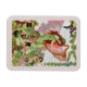 vintage fairylands illustrative painting with a beautiful lady faery with long reddish brown curly hair in a long green dress covered in clovers, large pink butterfly style wings, and clovers in her hair playing a large golden harp as tiny girl fairies and leprechaun faeries with green coats and black top hats dancing around in a circle.