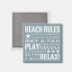 A inscrição gráfica branca num fundo azul denim esmaecido mostra as regras da praia - como se precisássemos de recordar! Mas por precaução, consulte este ímã quando precisar de um empurrão para relaxar, natação ou construir um castelo de areia.
