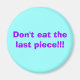 Imã de geladeira divertida com as palavras "Não coma o último pedaço!!!". É só uma maneira divertida de avisar as pessoas que não comam algo que você pode estar economizando para si mesmo.