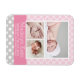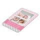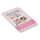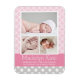 Ímanes modernos e quentes de anúncio de nascimento de bebês apresentam três fotos de sua doce garotinha emoldurada por na moda e padrões bolinhas. Esquema de cor branco, rosa claro, rosa brilhante e cinza de péletes macios.