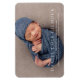 Personalizado com a fotografia, o nome, as estatísticas de natalidade, a mensagem e os nomes dos pais do bebê. Esta design usa tipografia moderna, simples, minimalista e chic. Expresse sua entusiasmo de anunciar o nascimento do seu filho e envie sua gratidão ao mesmo tempo. Uma placa de ímã permite que familiares e amigos exibam essas notícias especiais em superfícies magnéticas. Parabéns no seu novo pacote de alegria!