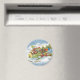 Ilustração Vintage viagem de Natal feliz e design de transporte apresentando um Papai Noel alegre voando no céu com elfos, brinquedos, bonecas, presentes embrulhados e uma árvore de Natal na asa. Eles estão voando o avião antigo através das nuvens brancas e estrelas fluffy no céu azul sobre uma vila e floresta fofinhos e quentes com árvores cobertas de neve na estação de inverno.