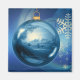 Gráfico com uma bola de natal azul, decorada com uma paisagem de inverno