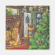 Ilustração vintage de design de Natal feliz apresentando uma árvore de Natal decorada e um fogo crepitante na lareira na sala de estar de uma adorável cabana de madeira. O interior da sala de estar de uma casa ou cottage encantadora nos bosques no inverno. Agulhas de tricô e fios estão pendurados sobre uma cadeira.