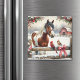 Cultivar o ímã de Natal com um bonito cavalo marrom e branco pintado com um cardeal macho e fêmea na cerca com um celeiro rústico no fundo de um dia nevado de inverno, a aquarela da arte ai.