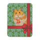 Design de Natal de hamster de Hammy, com um hamster fofo, fita vermelha e arco, e padrão de flocos de neve.