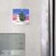 Um imã de Natal com um boneco de neve decorando uma árvore de Natal.