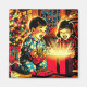 Uma doce ilustração de duas crianças asiáticas abrindo presentes no Natal feito em um estilo de pop de revista em quadrinhos. Bonito manutenção do íman festivo.