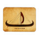 Uma nave longa Viking com uma vela vermelha vista no perfil do lado direito e sobreposta a uma imagem de fundo de papel antiga. Personalize adicionando seu próprio texto.