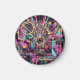 A vibrant psychedelic interior scene filled with neon light beams, geometric shapes, and luxurious décor. Crystal chandeliers, golden rings, and bold retro patterns create a surreal futuristic lounge atmosphere. The rich mix of pink, teal, and gold tones gives this artwork a striking visual energy inspired by modern psychedelic aesthetics and retro-futurism. Perfect for lovers of bold design, neon art, and imaginative luxury interiors.
