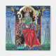 Pintura colorida, vibrante e contemporânea em cores dourada, azul, vermelha, verde, castanha. Um misterioso feiticeiro hipnótico com fantasias elegantes de veludo vermelho segurando uma esfera mágica sentada num trono gótico com gargantas e coruja. Ambiente é surreal, fantástico, alquímico onde você vê um testículo é bebendo de uma xícara, um monge templar voando sobre um sapo, bolhas transparentes, paisagens de fantasia com fogo infernal, céu azul cósmico com estrelas, montanhas do céu, árvores .Egg Tempera em um painel de madeira com folha de ouro. 1989, Miniatura Feita com técnicas pictoriais de 1300 por Alessandro Lumini (c) É também uma bela design de fantasia para Natal, Férias, Aniversário, Dia da Véspera de Ano Novo, Mardi Gras e Saudações de Carnaval.