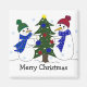Uma cena de inverno divertida com dois bonecos de neve em chapéus e lenços decorando uma árvore de Natal. Pequenos flocos de neve caem no fundo. O ditado "Feliz Natal" pode ser alterado como desejado.