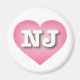 Este ímã apresenta um coração calmo, legal e colecionado cor-de-rosa com um centro lavado em branco contendo as letras maiúsculas e em negrito NJ, a abreviação oficial para New Jersey, o estado do jardim.