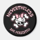 Um crânio de pirata e bósforos bonitos, com arco rosa e, "No entanto, ela persistiu". T-shirts, suores, autocolantes, botões, presentes.