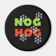 Texto vermelho e verde brilhante com flocos de neve brancos diz "Nog Hog" em T-shirts de feriado, sacos de tote, camisas, botões, e mais, perfeito para qualquer pessoa que ame ovos e que esteja à procura de uma design de férias divertida, fofa e algo humorística!