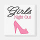 Camisas para a última farra das Noivas. Camisas de despedida de solteira com as palavras Noite das Meninas e o gráfico de um sapato de salto alto rosa. Design disponível em camisetas, bonés, canecas, canecas de cerveja, canecas de viagem, botões e mais.