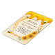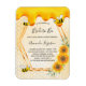 Elegante, divertido, chá de panela de ímã de verão. Um fundo amarelo com um padrão alveolado. Com uma falsa estrutura geométrica de ouro e mel doce pingando. Decorado com girassóis amarelos e laranja e abelhas-desabrochadas felizes. Com o texto: Bride to Bee o nome da noiva na frente, escrito com um moderno estilo escrito à mão. Letras negras. Pode ser usado como um lembrete de data para os convidados. Traseira: padrão amarelo de mel, design postal. Dica: Se você não quiser que pareça um cartão postal, clique em personalizar, vá para o verso e remova o divisor e o carimbo de posto.