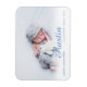 Imagem do anúncio de nascimento do bebê fotográfico para apresentar seu lindo bebê recém-nascido. Apresentando uma foto de bebê sangrando o cheio, nome de script azul suave e estatísticas de natalidade. Projetado por Thisnotme©