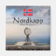Foto viagem do Cabo do Norte (Nordkapp) com coordenadas e a bandeira norueguesa. Norte da Noruega, Escandinávia.