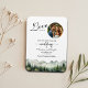 Uma elegante Imã salve a data de Casamento com montanhas de aquarela e pinheiros e uma foto especial que você pode personalizar com seus detalhes.