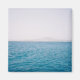 Ricas águas azuis do oceano Atlântico sob um céu azul claro com alguns dos vulcões de Lanzarote formando um pano de fundo névoo para a cena.