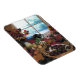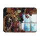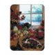 Esta fotografia é uma fotografia de um banquete a sair numa mesa. A luz que passa pela janela mostra gelo na janela. Várias verduras, frutas e sobremesas estão prontas para comemoração. Esses ímãs vêm em várias formas e tamanhos.