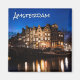 Foto-ímã de Souvenir com as antigas casas românticas da cidade de Amsterdã, construída ao longo do canal de Prinsengracht, com reflexo das luzes na água tranquila no início da noite na capital da Holanda com o texto 'Amsterdã'.