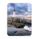 O farol de Peggy Cove no pôr do sol com nuvens dramáticas e um surf.