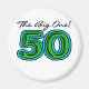 Um grande número de 50 em um texto azul legal, verde é apresentado em nossas t-shirts de 5-0 anos, canecas, botões e outros equipamentos de 50 anos. É o grande!