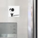 Olhos grandes e vestindo um terno preto e branco com gravata arco. Fundo branco.