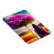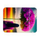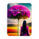 O ímã colorido apresenta uma paisagem surreal de sonho de uma mulher olhando sobre o vasto campo coberto de montanha com uma flor roxa central grande. Rumi busca citação na fonte moderna do roteiro sobre o céu. Imagem criada com o uso do software AI.