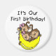 Três macacos pequenos, duas meninas e um menino, e uma banana amarela grande em t-shirt do primeiro aniversario das objectivas triplas, em bodysuits, em sacolas, em cartões, em etiquetas, em ímãs, e em muito mais.
