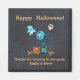 Um partido a favor de um imã para uma festa das bruxas. O texto do ímã diz: Feliz Halloween, Obrigados por vir ao nosso partido. Com o(s) seu(s) nome(s) personalizado(s)... com uma cena assustadora legal de halloween. Um fantasma azul gelado flutua no ar. Uma velha árvore morto tem uma coruja sentada em seus galhos e um morcego pendurado de cabeça para baixo. Uma mão está ascensão de uma sepultura antiga. Os morcegos estão voando ao redor de um cheio luando. Alguns doces estão cheios de dentro de brim, uma abóbora com milho doce espalhado. Um crânio paira no ar. Colocado sobre um fundo preto de quadro negro.