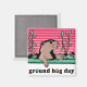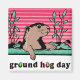 Esta marmota está aparecendo pela primeira vez em fevereiro para ver se ele consegue ver sua sombra. Um cheio de capim com algumas plantas é visível contra um fundo cor-de-rosa e rosa. Uma joaninha está rastejando em um monte de grama. O Dia do Groundhog é impresso sob o design. Esses ímãs estão disponíveis em formas e tamanhos variados. Também disponível em duas cores diferentes.