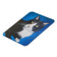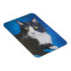 Retrato pintado de um tuxedo preto e branco com olhos amarelos. O gato encara o espectador olhando levemente para um lado em uma pose de gato real. O retrato de estimação do gato é acentuado contra um fundo azul real. Personalize este ímã de retrato de gato legal com o seu próprio texto e imagens personalizados para fazer presentes especiais de amantes de gatos!