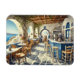 Presente perfeito para o amante de viagem e café. A pintura a aquarela retrata o charme tranquilo e idílico de um compro de café a céu aberto em Santorini. O espaço apresenta paredes brancas com sotaques azuis e aberturas arqueadas que enquadram visões impressionantes do espumante Mar Egeu. As mesas de madeira com cadeiras mais velhas estão espalhadas por toda parte, cada uma enfeitada com vasos de flores vibrantes da bougainvillea. Um contador de pedra natural exibe um tradicional pote de café grego, pastéis e uma máquina de café expresso. À superfície, uma pergola de madeira enrolada com cipós esmagadoras proporciona uma sombra parcial, criando luz solar aplicada no piso rochoso. Os Patrões sentam-se com lealdade, tomando café e ou olhando para o mar ou engajando-se em conversas silenciosas. As icônicas cores branca e azul de Santorini se harmonizam lindamente com a beleza natural da paisagem ao redor.
