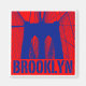 Uma visão de perto da ponte do Brooklyn entre os cabos. Os cabos formam uma teia de aranha feita pelo homem com a imponente torre de pedra da ponte ao fundo. A palavra Brooklyn em texto de bloco é mostrada na parte inferior com um fundo de cor sólida. Disponível em várias variações de cor.
