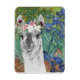 A bela e artística compilação digital apresenta a pintura de arte Irises Irises de Vincent Van Gogh como pano de fundo para uma adorável lama de aquarela com uma coroa rico de flores.