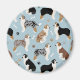 Pastores australianos lindos / Cães australianos em casacos pretos, marrons e de funil sentam-se e mantêm ossos de cães espalhados e estampas de pata em um fundo azul claro.
