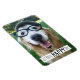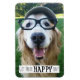 É um dia feliz! Este ímã mostra uma fotografia de um sorridente cão que recupera ouros que está vestindo um chapéu e óculos. O texto diz: "Fica feliz!"
