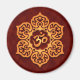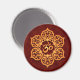 Um design Aum ou Om senta-se no dentro de uma flor de lótus estilizada. O padrão circular é colorido com um ouro amarelo que é realçado para criar um brilho de luz na superfície. O fundo é pintado de vermelho profundo que pode ser visto através do espaço negativo da flor. Uma sombra aparece logo abaixo do fazer design parece flutuar logo acima da superfície do ímã. Esta na moda é uma representação impressionante deste símbolo espiritual.