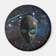 Cabeça de alienígena com olhos brilhantes e três discos voadores com luzes brilhantes no fundo. Excelente de convenções de OVNI!