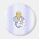 Um pacificador azul com uma margarida sobre um fundo azul e branco listrado em ímãs e botões de bebês que você pode personalizar com um nome.