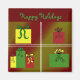 Presentes de férias bonito em cores brilhantes de amarelo, vermelho e verde com arcos bonito no topo. Um fundo vermelho profundo e "feriados felizes" em texto verde.