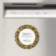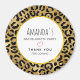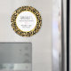 Um ímã de agradecimento de despedida de solteira com um padrão elegante. Manchas pretas exóticas de leopardo em um fundo dourado. Estilo selvagem e elegante. Sobreposto no topo há uma moldura circular branca com uma borda de folha dourada falsa, com o seu texto personalizado dentro.