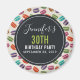 Um ímã de aniversário com um padrão fofo de macarons em muitas cores diferentes com um padrão de bolinhas fraco por trás. Suas informações personalizadas de aniversário escritas em branco dentro de um círculo preto.