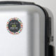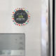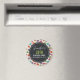 Um ímã de aniversário com um padrão fofo de macarons em muitas cores diferentes com um padrão de bolinhas fraco por trás. Suas informações personalizadas de aniversário escritas em branco dentro de um círculo preto.
