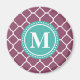 Um padrão de fundo de latência marroquina de ameixa quatrefoil roxa, de tendências, na moda, girly plum roxa com um quadro azul-aqua e branco para sua letra inicial de monograma personalizado.